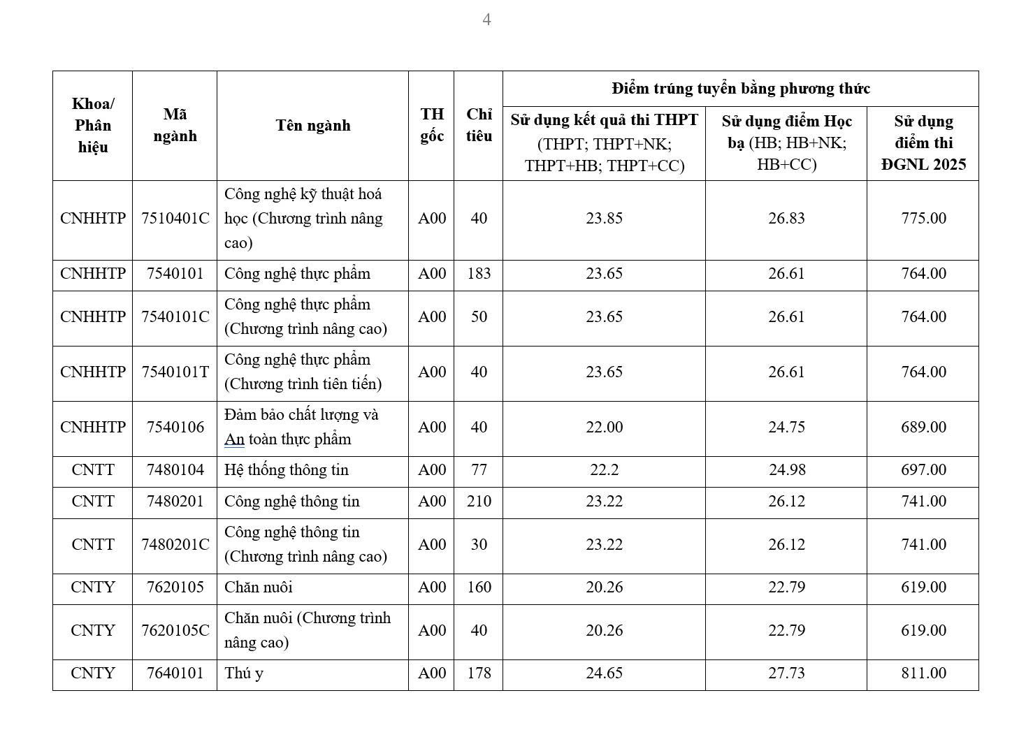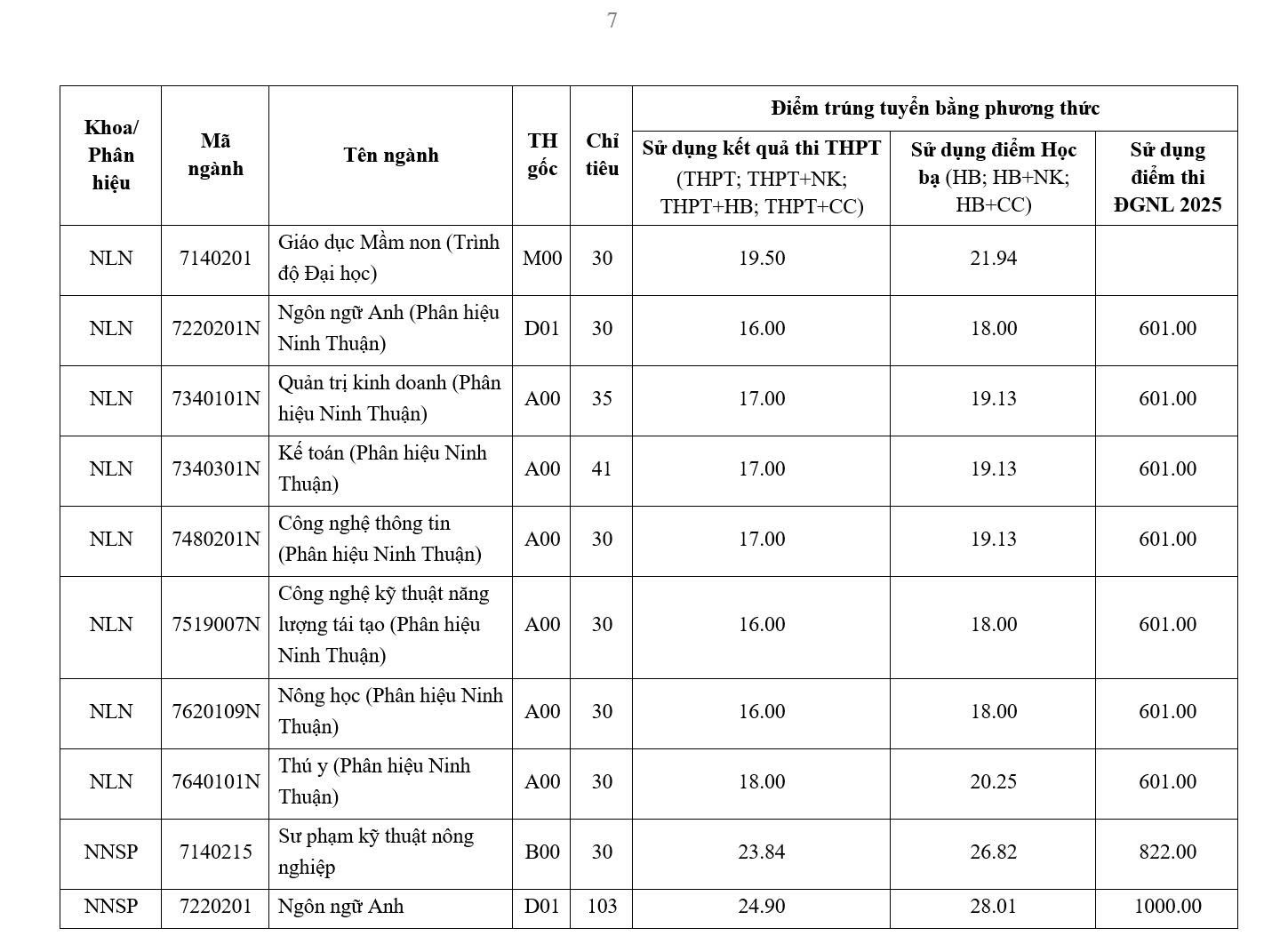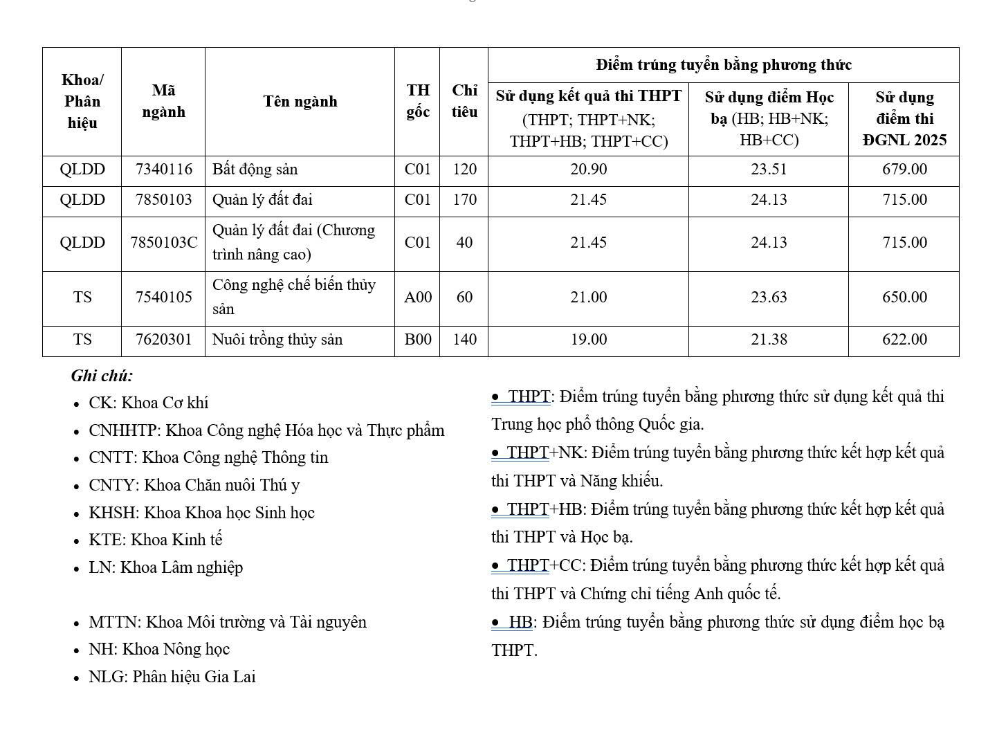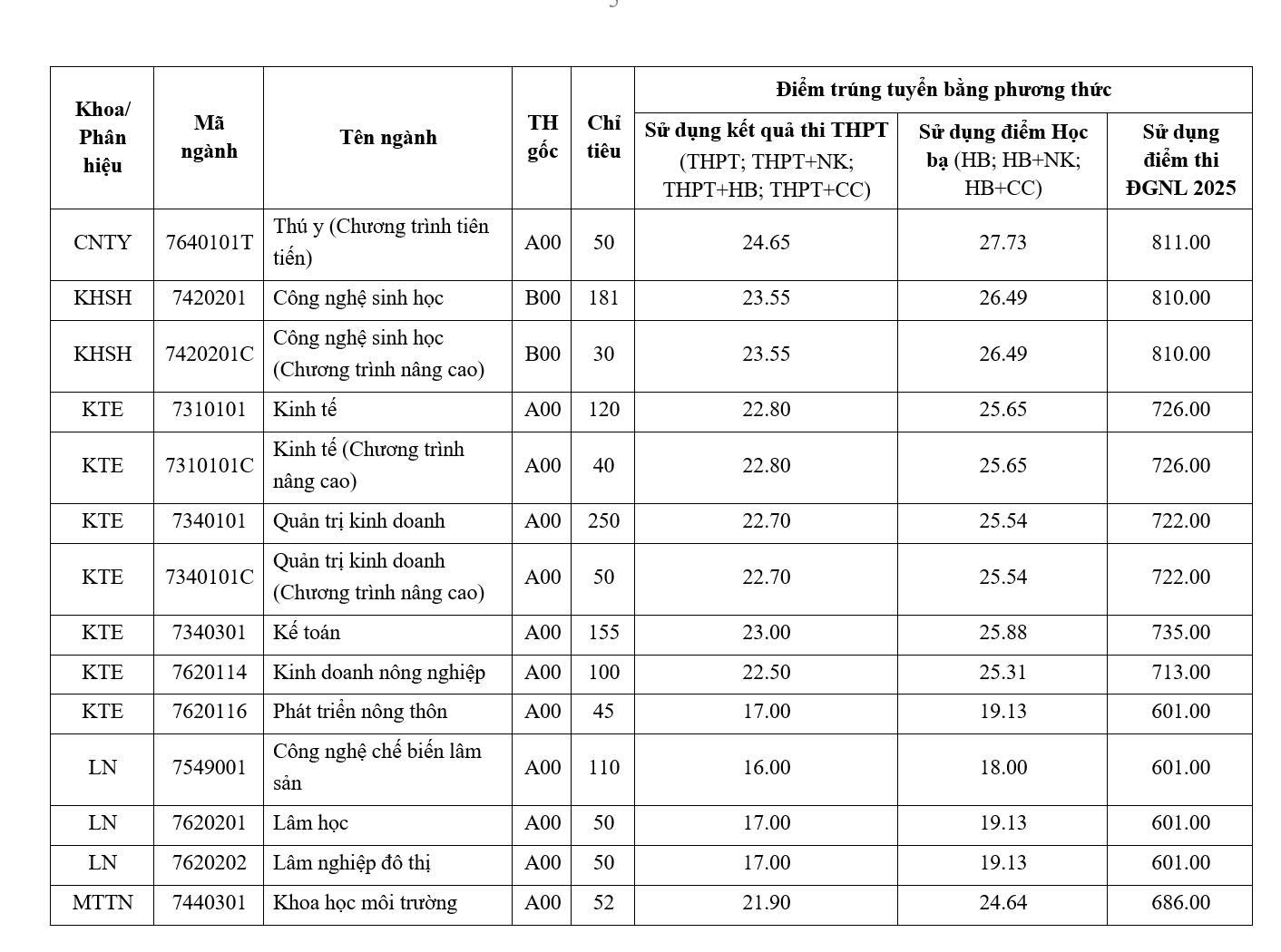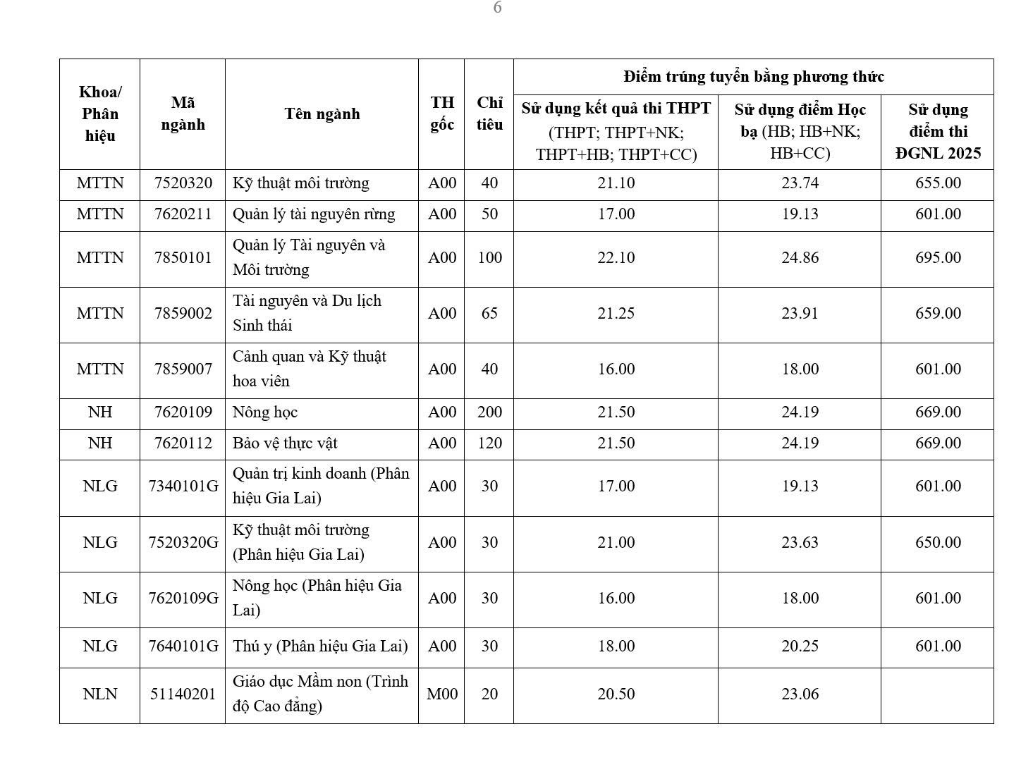 Сільськогосподарська обробка, ландшафтна та садова інженерія, технології лісової переробки, технології відновлюваної енергетики (відділення Нінь Тхуан ), агрономія (відділення Нінь Тхуан, відділення Гіа Лай), англійська мова (відділення Нінь Тхуан) – це спеціальності з найнижчими стандартними балами, усі по 16 балів.