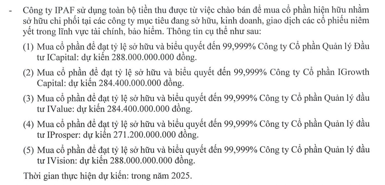 سرمایہ اکٹھا کرنے کے بعد، زیادہ تر IPA سے، IPAF پیشکش سے حاصل ہونے والی تمام آمدنی کو حصص حاصل کرنے کے لیے استعمال کرے گا، جو کہ 99.99% ملکیت اور پانچ کمپنیوں میں ووٹنگ حصص تک پہنچ جائے گا: ICapital Investment Management Joint Stock Company، IGrowth Capital Joint Stock Company، IValue Investment Management Joint Stock Management Company، IPtrois انوسٹمنٹ مینجمنٹ جوائنٹ اسٹاک کمپنی، جوائنٹ سٹاک مینجمنٹ کمپنی اور جوائنٹ سٹاک کمپنی۔ جوائنٹ اسٹاک کمپنی۔ ان کمپنیوں میں حصص کی خریداری کے لیے مختص رقم بالترتیب VND 288 بلین، VND 284.4 بلین، VND 284.4 بلین، VND 271.2 بلین، اور VND 288 بلین ہونے کی توقع ہے۔