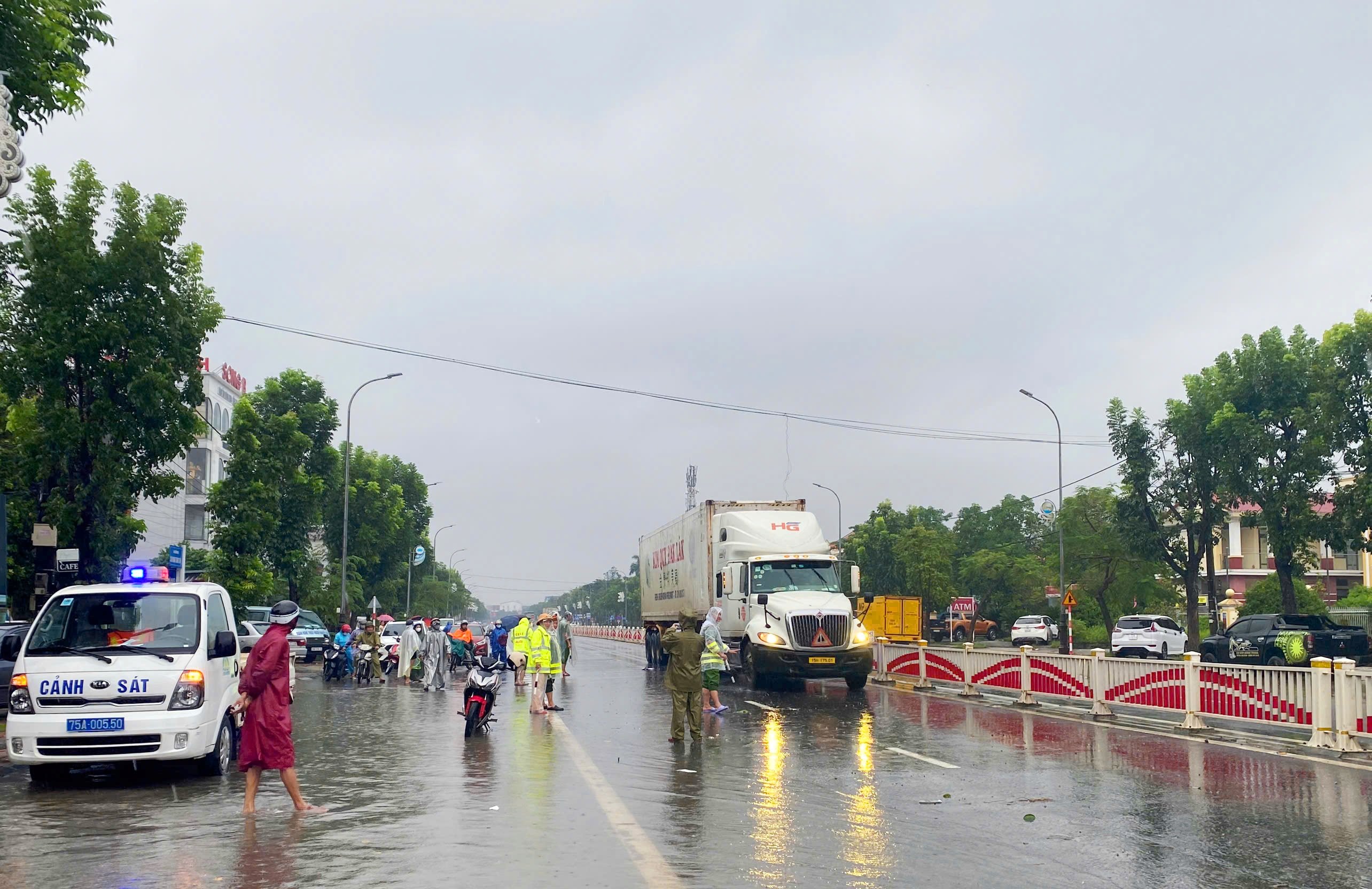 گہرے سیلاب اور تیز دھاروں کی وجہ سے، ہوونگ ٹرا وارڈ پولیس نے سٹی ٹریفک پولیس کے ساتھ فعال طور پر رابطہ قائم کیا تاکہ لوگوں کو سیلاب زدہ علاقوں سے قومی شاہراہ 1A پر ٹریفک میں محفوظ طریقے سے حصہ لینے کے لیے ہدایت، ریگولیٹ اور رہنمائی فراہم کی جا سکے۔
