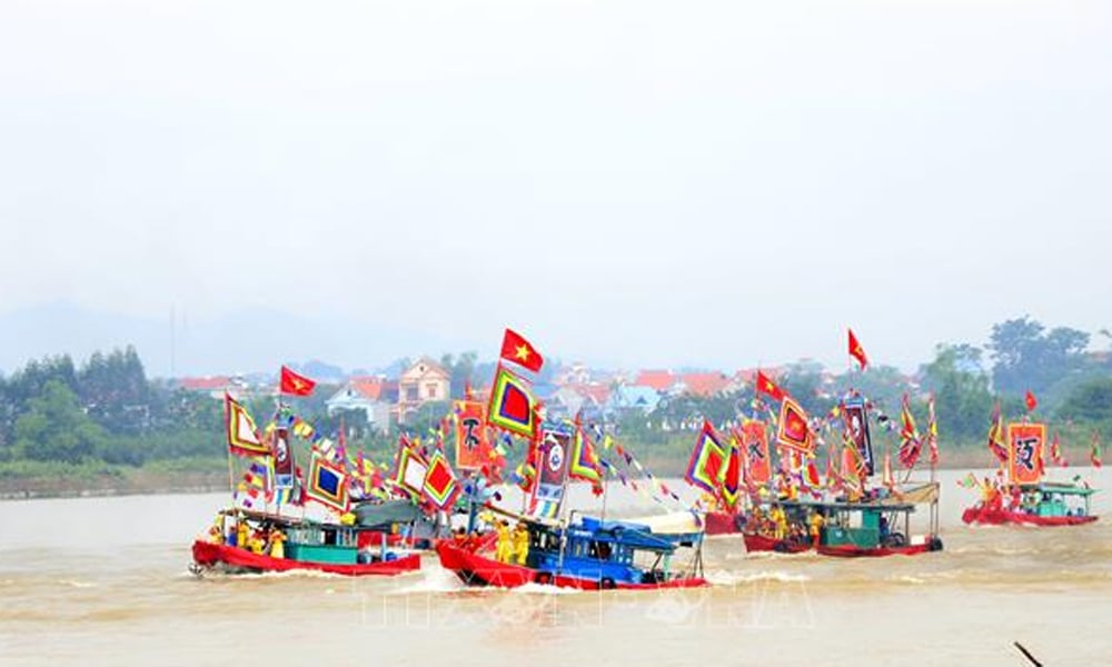 کشتیوں کے ٹولے نے دریا پر ایک جنگ کا مظاہرہ کیا، فوجی اجتماع اور پریڈ کو دوبارہ پیش کرتے ہوئے ماضی میں ٹران خاندان کی فوج اور لوگوں کی مزاحمتی قوت کا مظاہرہ کیا۔ (تصویر: وی این اے) |