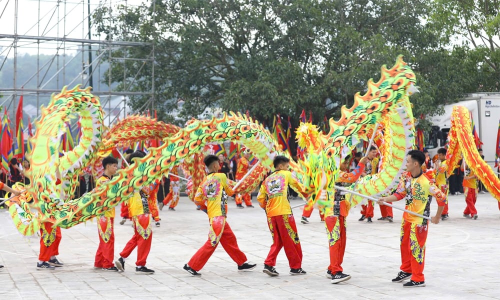 صبح سویرے ہی دریائے کیپ بیک کے دونوں کنارے جھنڈوں اور پھولوں سے بھرے ہوئے تھے، پہاڑوں اور جنگلوں میں ڈھول، گانگوں اور خوشامد کی آوازیں گونج رہی تھیں۔ پریڈ میں 5000 سے زائد افراد نے شرکت کی جن میں وان گیانگ اور ڈونگ ٹریو ( کوانگ نین ) دریاؤں کے رہائشی، کین این (ہائی فوننگ) کے ساتھ 50 جلوسی کشتیوں، ناٹ نام کے مارشل آرٹس اسکول کے 400 طلباء، تران ہنگ ڈاؤ وارڈ کے 100 آنر گارڈز اور ڈوکورن گاوں کے دو سنڈراگون ڈانس ٹیم شامل تھے۔ وان ین، اور ہر طرف سے ہزاروں لوگ اور سیاح۔