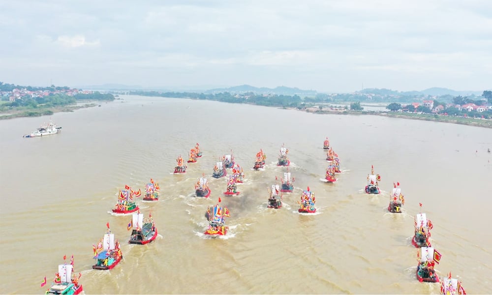 دریا پر، وان گیانگ، ڈونگ ٹریو اور کین این سے کشتیوں کے تین بیڑے بیک وقت Luc Dau Giang چوراہے کی طرف روانہ ہوئے - چھ دریاؤں کا سنگم - ایک شاندار منظر تخلیق کر رہا ہے، جو Dai Viet کے پہاڑوں اور دریاؤں کے "پہاڑوں اور پانیوں کے ایک دوسرے کے مل جانے" کی علامت ہے۔