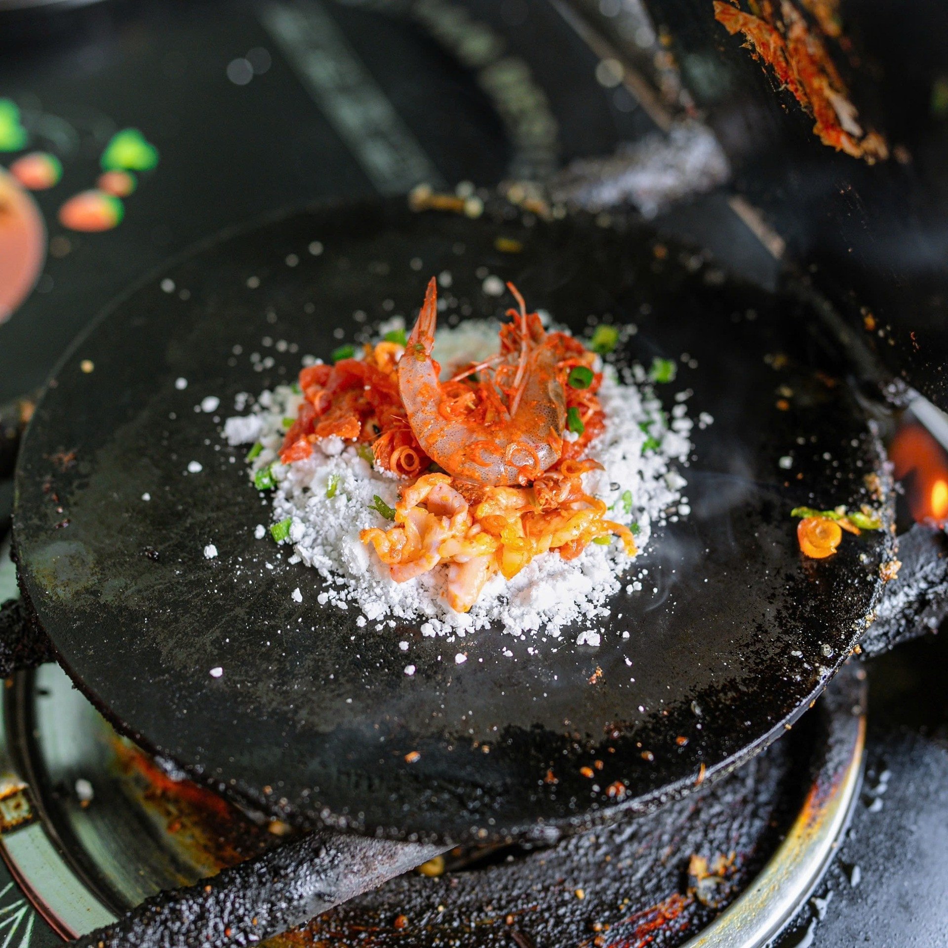 کچھ جگہوں پر، شیف آٹے کو چھوٹی گیندوں کی شکل دے گا، اوپر تھوڑا سا گوشت اور ہری پیاز ڈالیں گے، پھر انہیں دو گرم کاسٹ آئرن پلیٹوں کے درمیان دبائیں گے۔