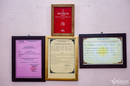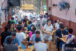 Au Trieu سٹریٹ پر Michelin Pho ریستوراں میں، دو غیر ملکی مہمان خوشی سے فٹ پاتھ پر پلاسٹک کی کرسیوں پر بیٹھ کر 65,000 VND/ سرونگ کے لیے لذیذ کھانا کھا رہے تھے۔