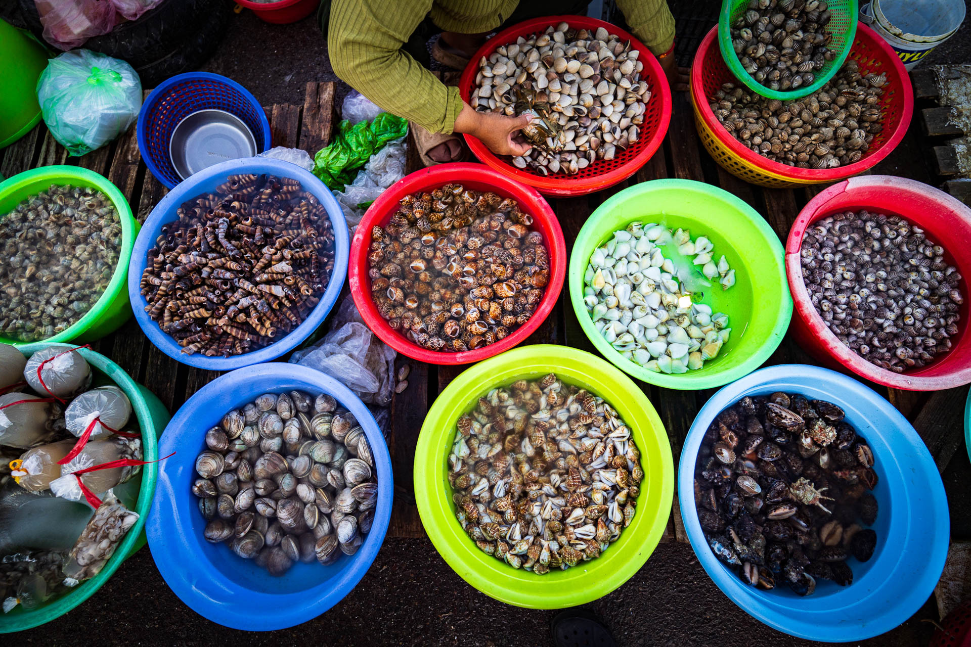 مارکیٹ میں سمندری غذا تازہ، متنوع اور معقول قیمت ہے جیسے سیپ 40,000 VND/kg، کیکڑے کے پنجے 50,000 VND/kg، نیلے کیکڑے 500,000 VND/kg، اور جمپنگ snails 50,000 VND/kg۔