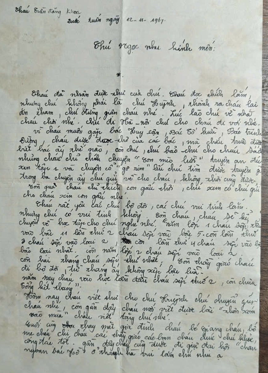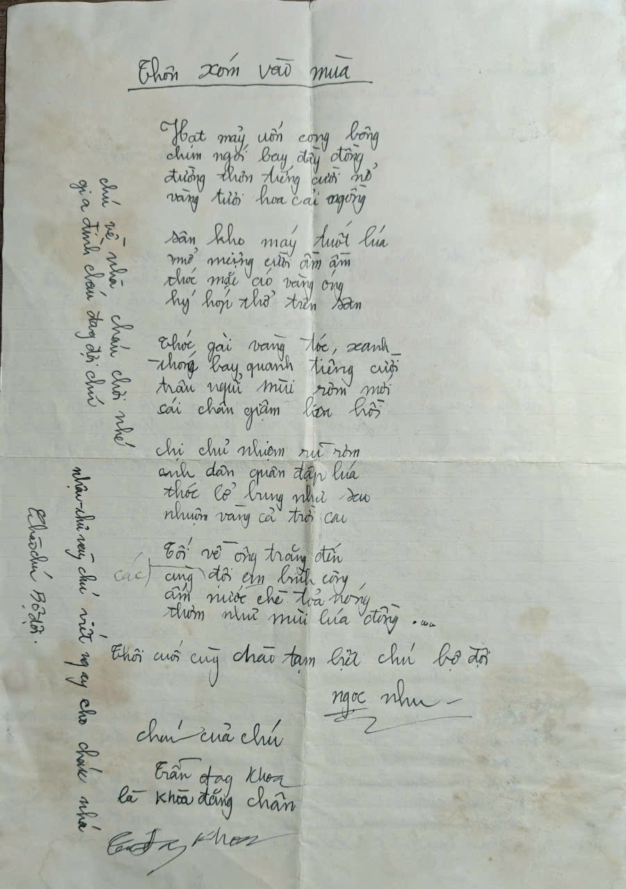 خط حوالے کرتے ہوئے، محترمہ تھو نے وضاحت کی: "مجھے ابھی یہ خط اپنے والد کے کاغذات کے ڈھیر میں ملا ہے۔ میں اسے آپ کو بھیجتی ہوں..."۔ میں نے شاعر ٹران ڈانگ کھوا کو دکھانے کے لیے بلایا… کیا حیرت ہے! اس نے فون پر آواز لگائی اور جذباتی انداز میں کہا: "بہت قیمتی، وہ خط میرے لیے بہت خاص ہے۔ نصف صدی سے زیادہ عرصے سے میں نے اپنے شاعروں کو جو خط بھیجے ہیں، ان میں سب سے خاص، خاص اس لیے نہیں کہ میں نے لکھا تھا، بلکہ اس لیے کہ خط وصول کرنے والا تھا- چچا نہو ملک کے پہلے رپورٹر تھے جو میرے گھر آئے، سوالات پوچھے، مجھے آرمی پبلک میں ایک آرٹیکل لکھ کر شائع کیا۔ اور اس سے بھی زیادہ خاص بات یہ ہے کہ وہ ایک شہید ہیں اور میں ان کی قربانی کے بارے میں اچھی طرح جانتا ہوں کہ میں نے جو خط لکھا تھا وہ انکل نگوک نہو تک نہیں پہنچا تھا، اس وقت تک انکل کم ڈونگ کے دوست، انکل کو واپس دیکھنا چاہتے تھے۔