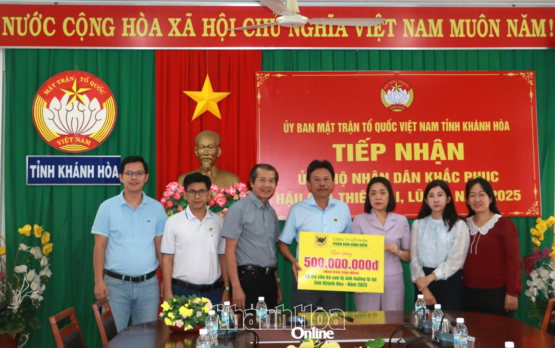 | بن ڈین فرٹیلائزر جوائنٹ اسٹاک کمپنی کے نمائندے نے صوبے کی ویتنام فادر لینڈ فرنٹ کمیٹی کے رہنماؤں کو سیلاب سے متاثرہ علاقوں میں لوگوں کی مدد کے لیے فنڈنگ کا ایک علامتی بورڈ پیش کیا۔ |