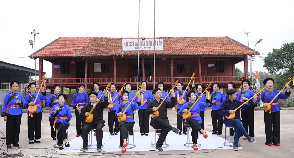 Từ quốc lộ 1 rẽ con đường được “cứng hóa” vào Má Bắp gặp ngay cổng thôn mới được xây dựng, hai bên là đồng ruộng xanh tốt và những ngôi nhà khang trang phản ánh cuộc sống ấm no, trù phú ở nơi này. Nhà văn hóa thôn là căn nhà sàn đặc trưng của dân tộc Nùng nằm giữa khuôn viên rộng hàng trăm mét vuông. Các thành viên Câu lạc bộ đàn tính, hát then thôn Má Bắp lục tục kéo đến, những người đến sau tươi cười giải thích: “Cố hái xong luống đỗ, chăm đàn gà để yên tâm đi hát”.