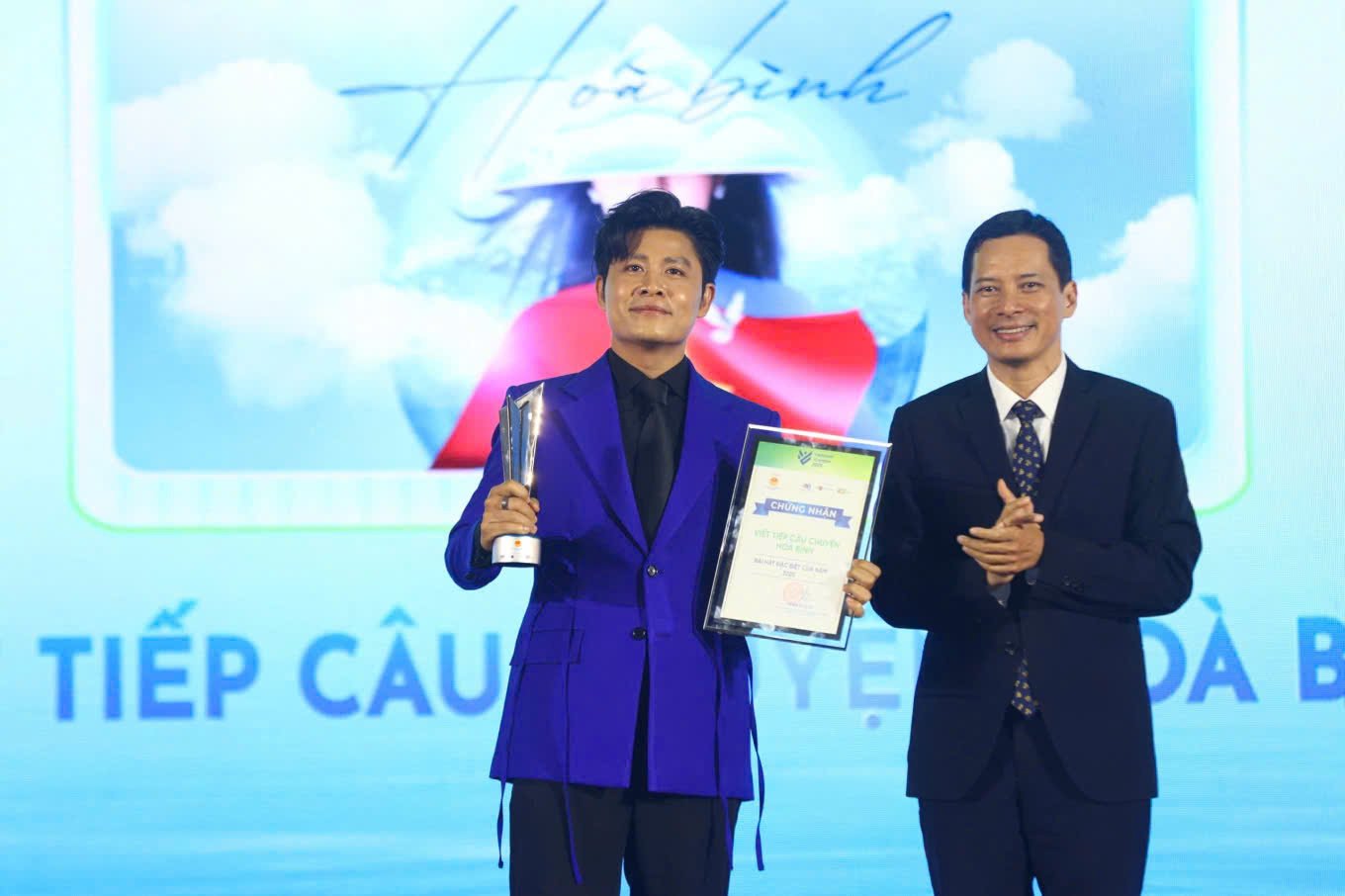 Cục trưởng Cục Phát thanh, truyền hình và thông tin điện tử Lê Quang Tự Do trao giải "Bài hát đặc biệt của năm" cho tác phẩm Viết tiếp câu chuyện hòa bình.(Ảnh: Quỳnh Tùng)