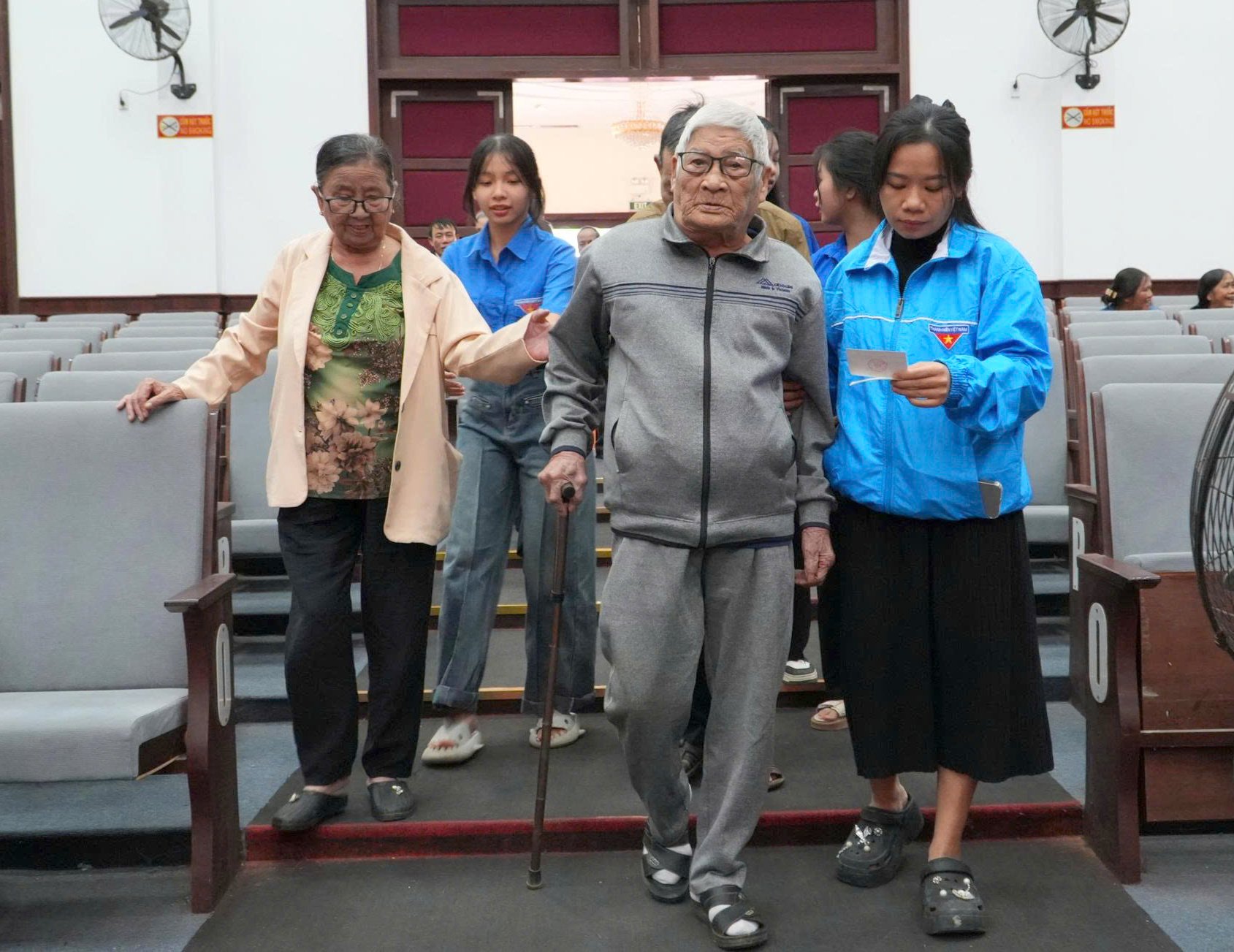 | Đoàn viên thanh niên hỗ trợ những người lớn tuổi đến xem phim. Ảnh: Ngọc Hiếu |
