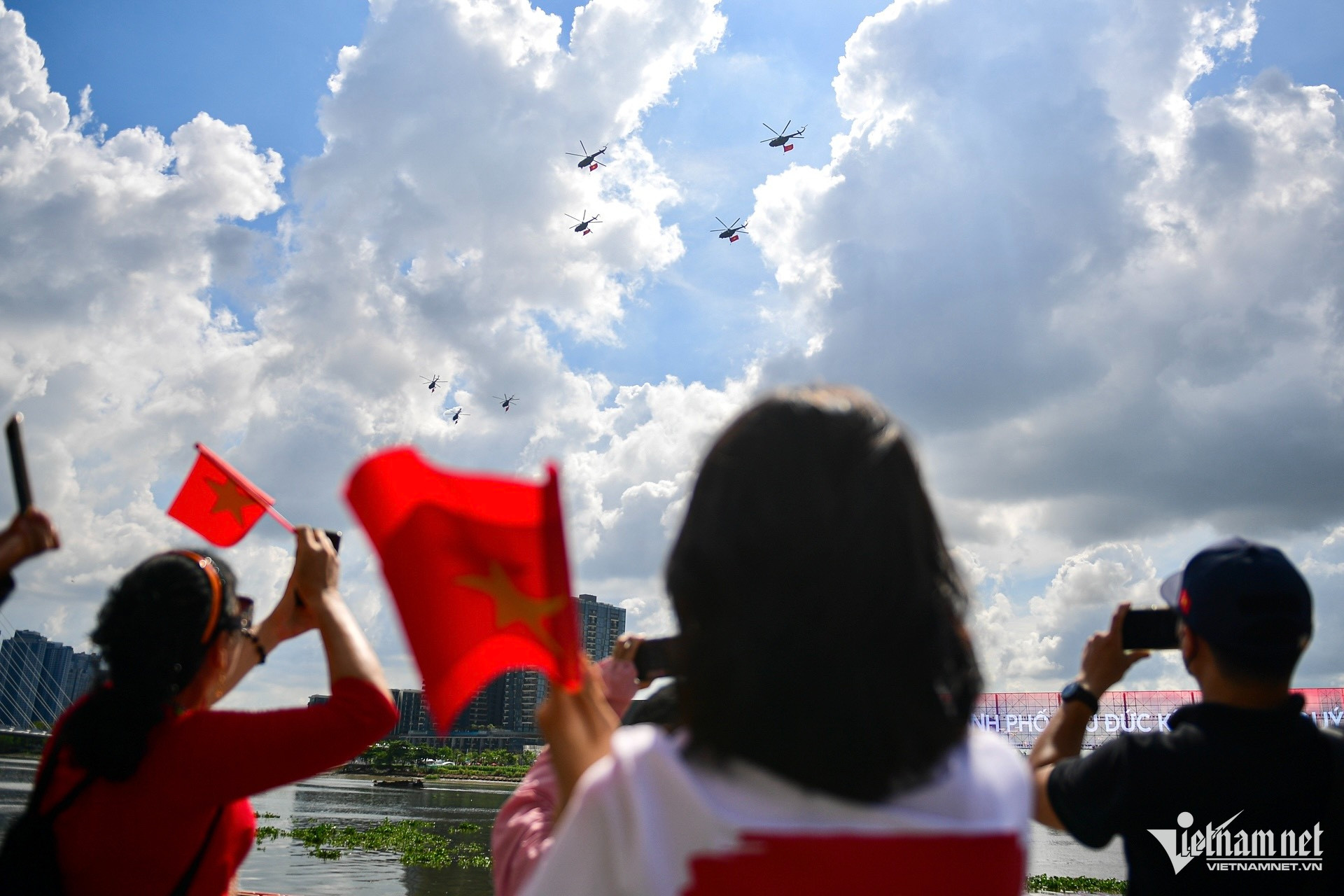 Hàng trăm người dân tập trung hai bên bờ sông Sài Gòn theo dõi màn tập luyện của dàn phi cơ quân sự, tranh thủ ghi lại những khoảnh khắc hiếm thấy trên bầu trời thành phố. Ảnh: Thế Bằng.