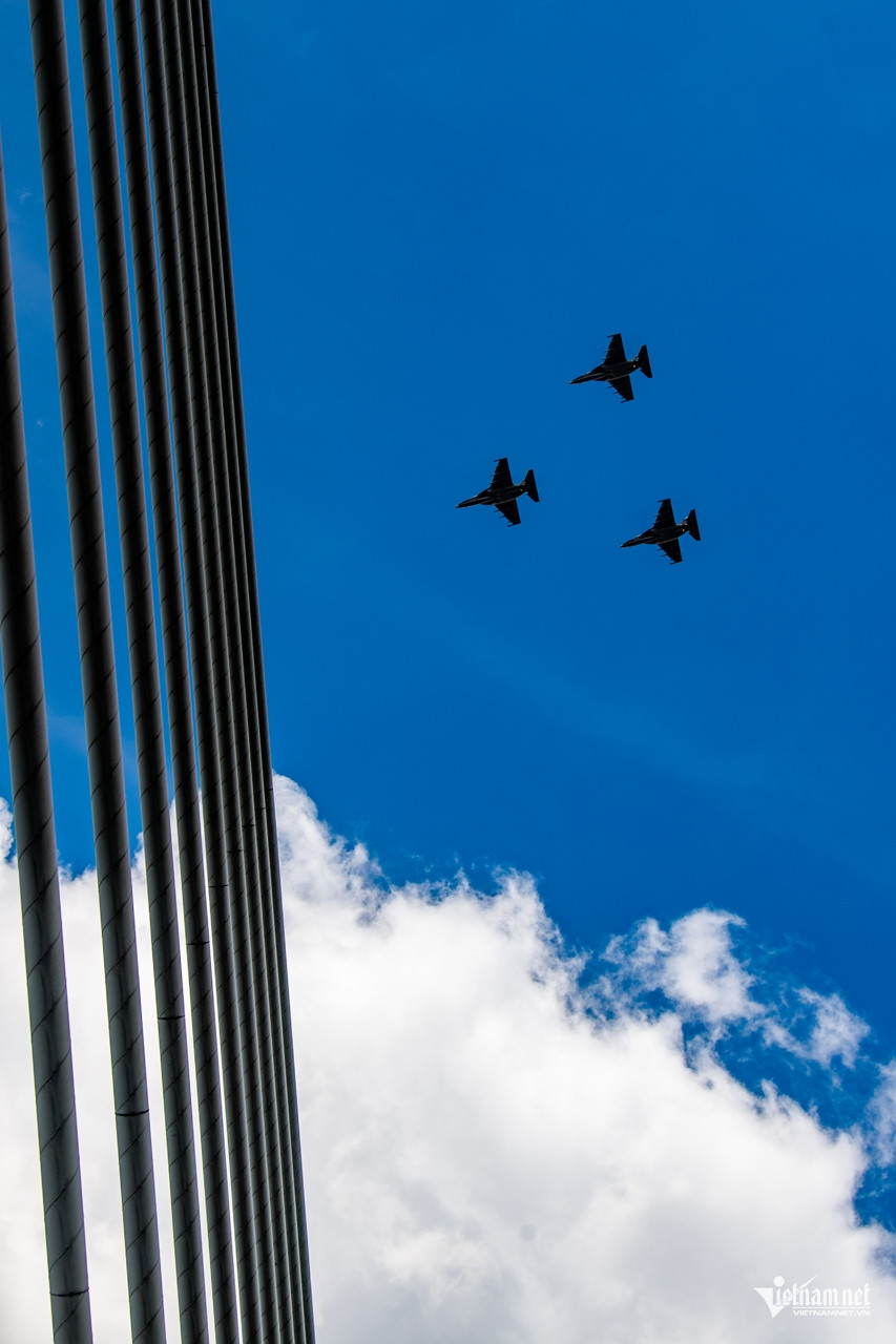 Đây là đợt bay kiểm tra kỹ thuật cuối cùng giữa các tốp máy bay, đồng thời để cân chỉnh với các phần trình diễn mặt đất. Ảnh: Thạch Thảo.