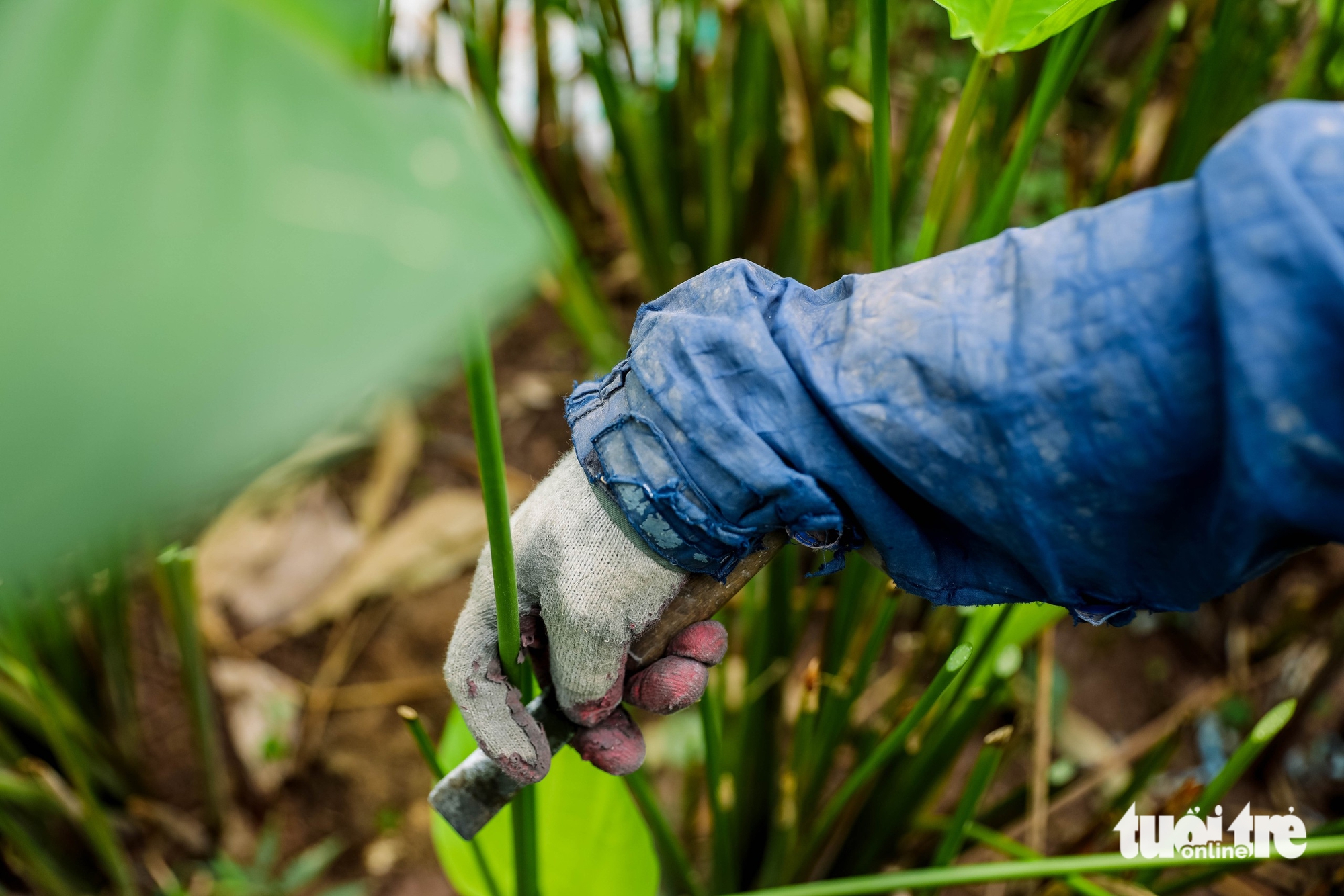 Công đoạn cắt lá đòi hỏi sự khéo léo và dứt khoát, từng cuống lá được cắt sát gốc giúp cây tiếp tục sinh trưởng cho những vụ tiếp theo - Ảnh: DANH KHANG