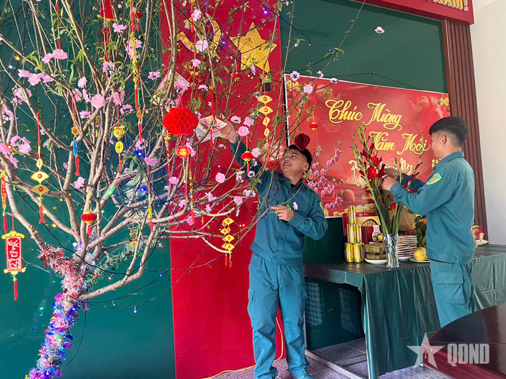 Gói bánh chưng xong, cán bộ, chiến sĩ trong Chốt lại bắt tay vào chỉnh trang đơn vị. Ở căn phòng sinh hoạt chung, cành đào rừng được các chiến sĩ sao vuông tranh thủ mang về từ sườn núi gần đó, khéo léo cắm vào chiếc lọ và trang trí thêm đèn lồng, câu đối. Bên cạnh đó là mâm ngũ quả, được đặt trang trọng dưới tượng Bác và lá cờ đỏ sao vàng.